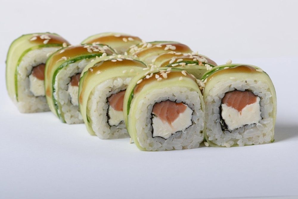 Огурец, Сливочный сыр, Тунец, Унаги соус, Кунжут.