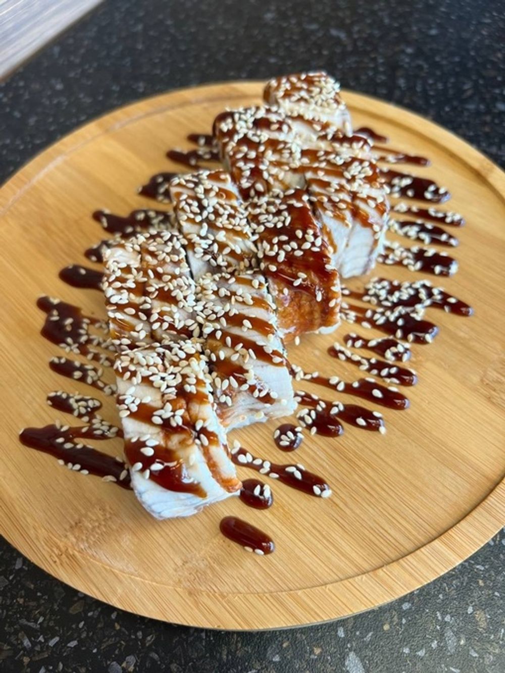 Угорь, Креветка, Сливочный сыр, Огурец, Унаги соус, Кунжут.