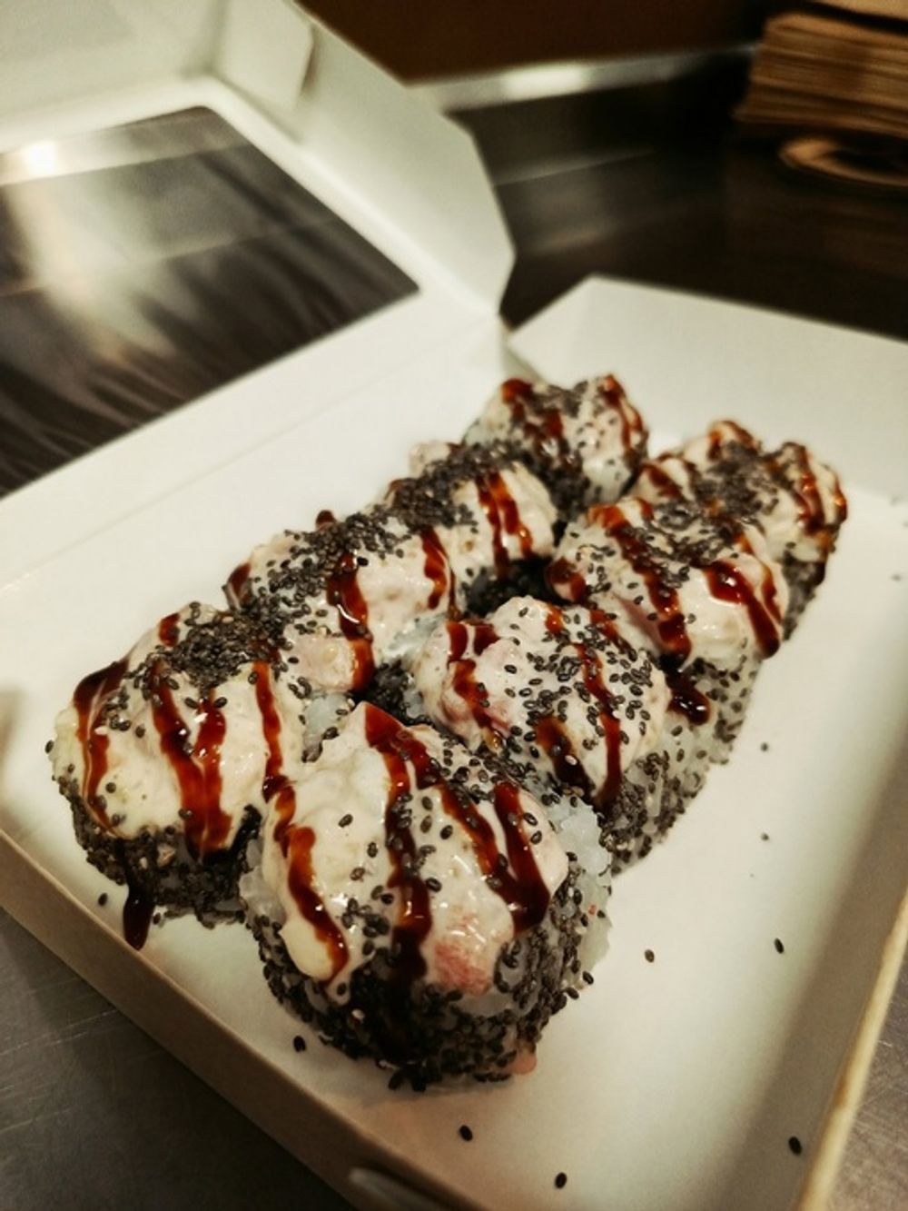 Рис , сыр сливочный , угорь , авокадо ,тунец , креветка , семена чиа .