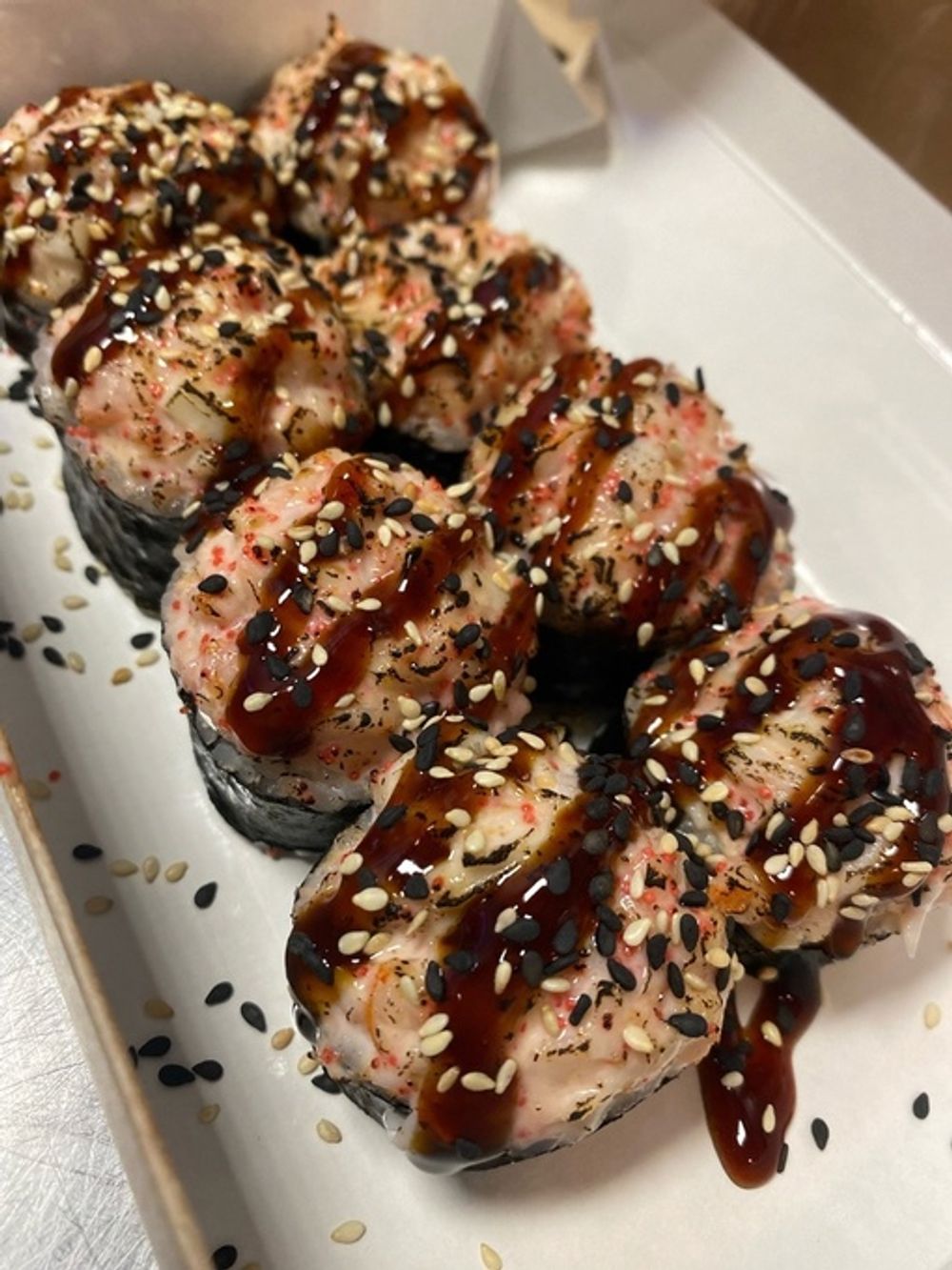 Сливочный сыр, крабовое мясо, угорь, огурец , соус ореховый, креветка, масаго, соус унаги, кунжут