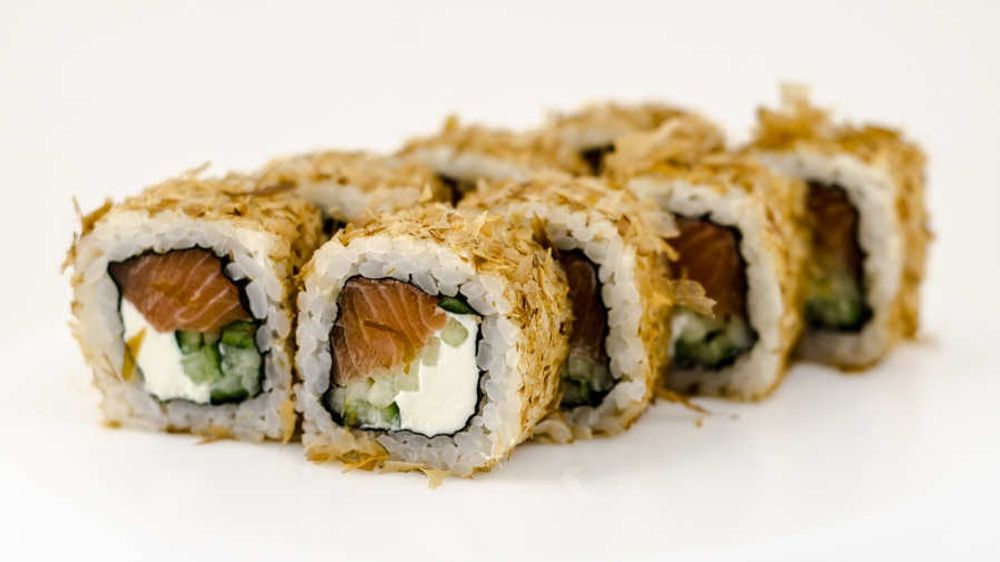 Сливочный сыр, огурец, лосось копчёный, стружка тунца,