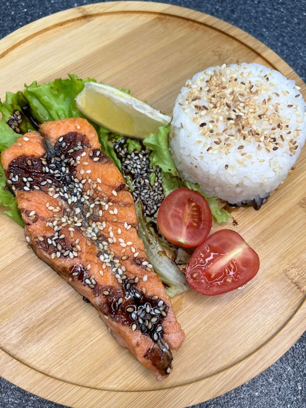 Состав: форель, рис, салат, помидоры, лимон , соус.
