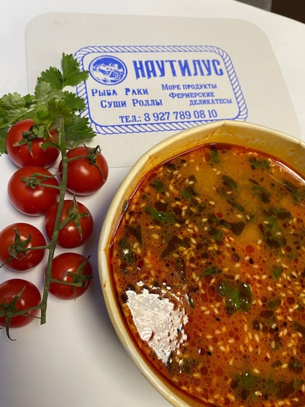 Вода, паста том ям (лемонграсс, лук шалот,тамаринд ,перец чили, корень галангала), хондаши, лайм, кокосовое молоко, кунжут, кинза свежая, томаты черри, креветки.