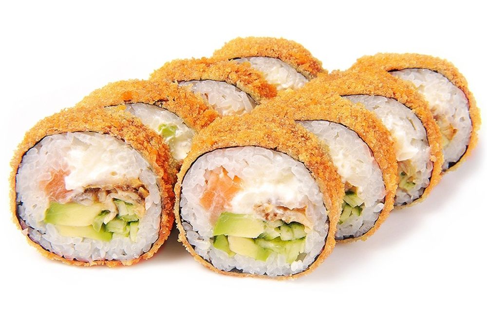 сыр сливочный, угорь, лосось жаренный, огурец, кляр, сухари .