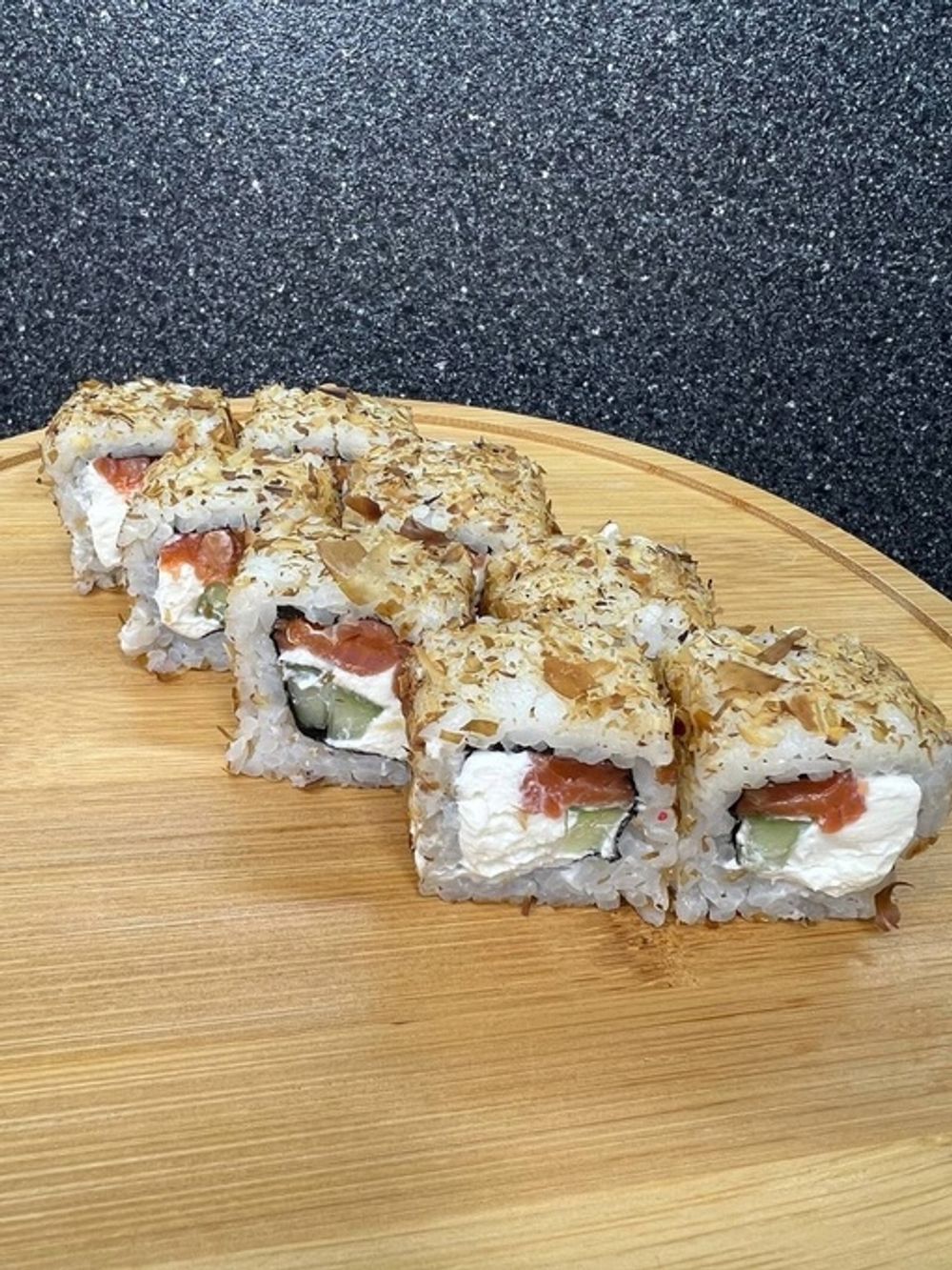 Сыр, копчёный лосось, огурец, стружка тунца.