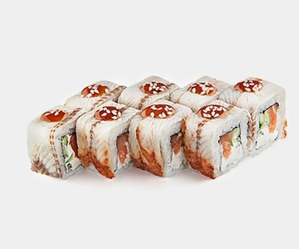 Сливочный сыр, лосось, огурец, угорь, унаги соус, кунжут.